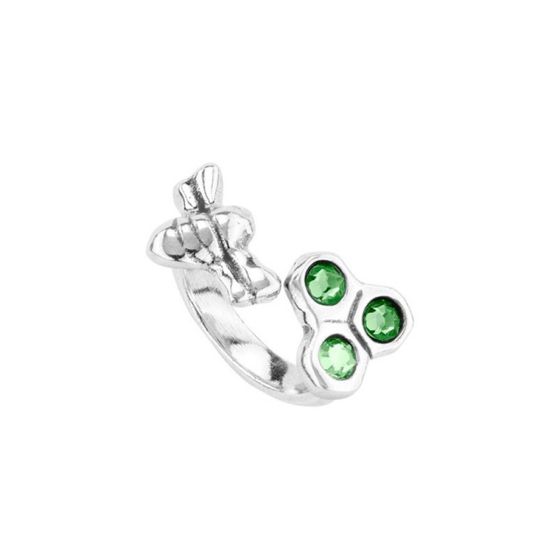 Precioso anillo abierto de metal bañado en plata rematado en sus extremos: uno en forma de una delicada abeja, y el otro retratando las líneas de una colmena, con figuras hexagonales, y tres cristales verdes SWAROVSKI® . Con un estilo orgánico e inspirado en la naturaleza, está disponible en varias tallas. La joya está hecha en España 100% a mano, con un diseño único e inconfundible de UNOde50®