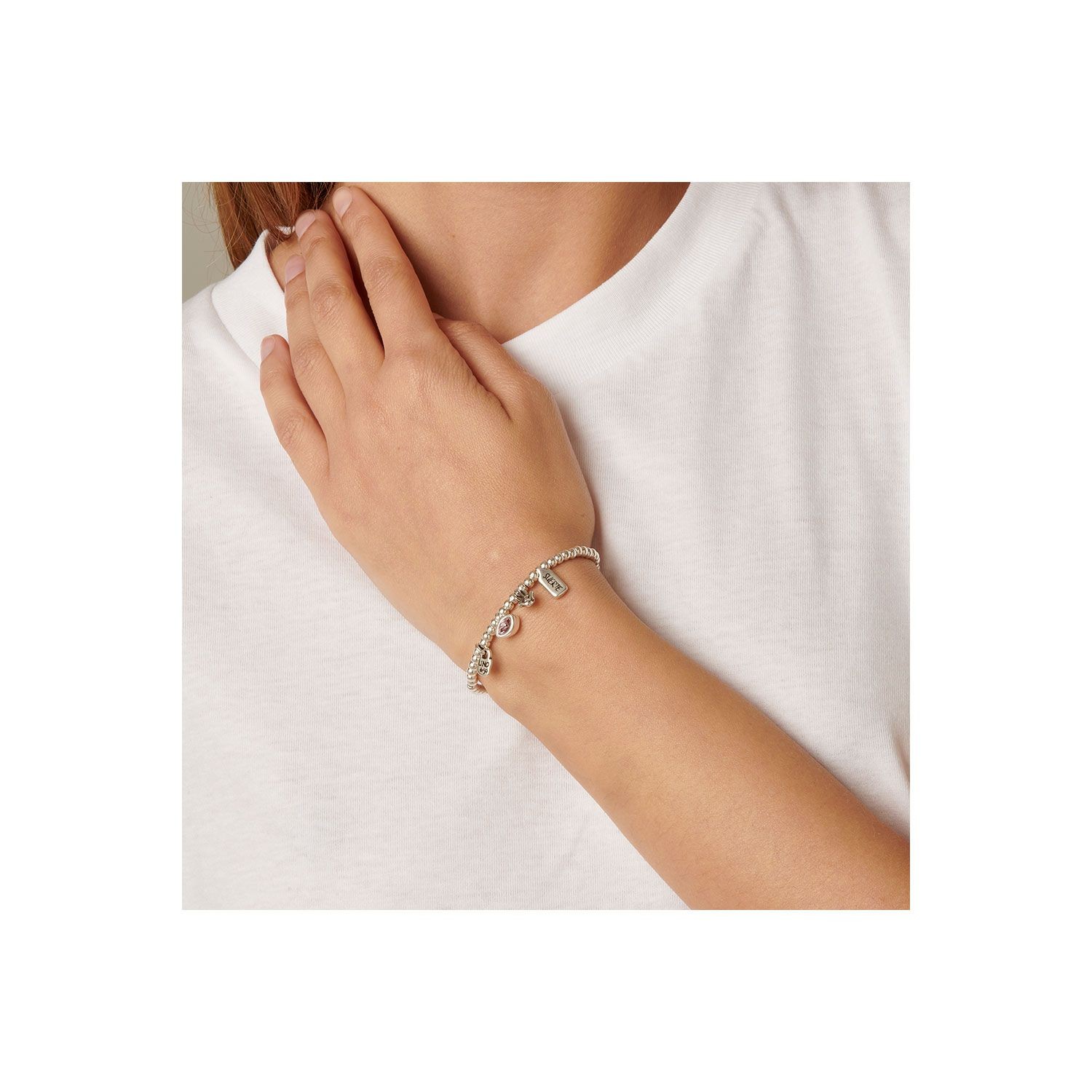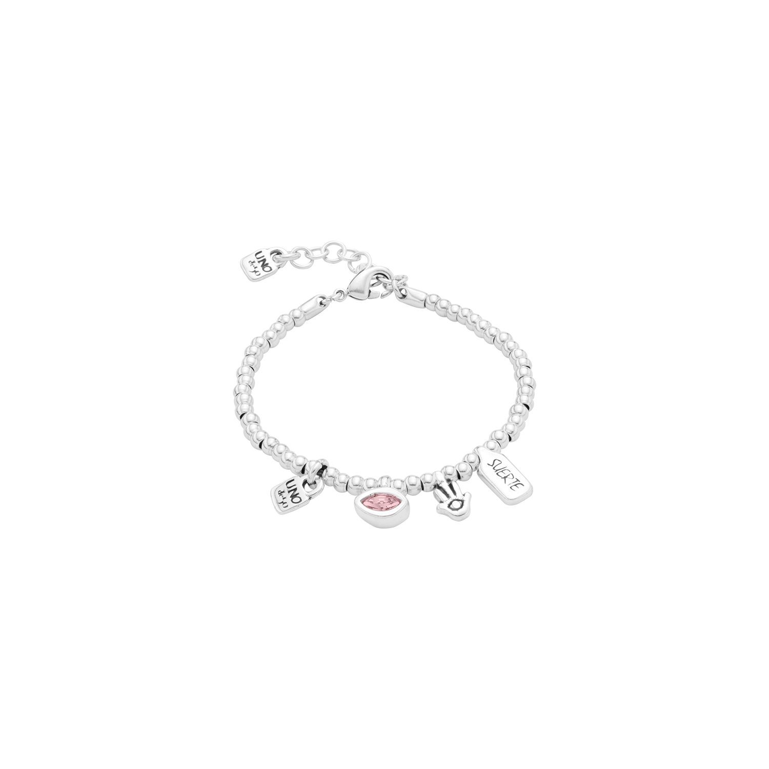 Inusual pulsera de mujer de metal bañado en plata. Inspirada en el misticismo de las culturas arábigas, esta pulsera consta de múltiples piezas de las que cuelgan cuatro charms: el candado propio de UNOde50®, un medallón oval con cristal rosa de SWAROVSKI® , un charm de borde irregular con la palabra «suerte» y la misteriosa Mano de Fátima, portadora de la protección y la suerte. La joya está fabricada en España bajo un proceso 100% artesanal, con un diseño único e inconfundible de UNOde50®